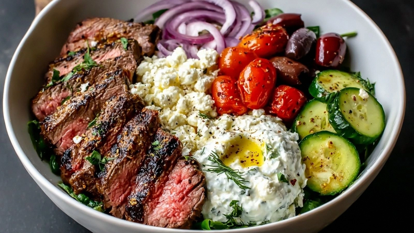 - Now it’s time to assemble. Start with a generous scoop of your chosen base—brown rice, quinoa, or cauliflower rice—in the bottom of each bowl. Layer the sliced steak on top, followed by the roasted chickpeas, cherry tomatoes, cucumber slices, red onion rings, kalamata olives, and a handful of crumbled feta. Finish with a drizzle of yogurt sauce and a final splash of olive oil. The result should look like a vibrant mosaic, each color popping against the others.