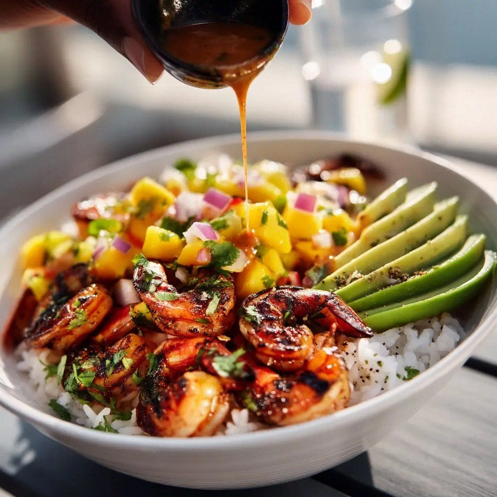 Use a plant‑based shrimp alternative or replace the shrimp entirely with marinated tofu cubes. Keep the rest of the ingredients unchanged for a vegan bowl that still delivers on flavor and texture.